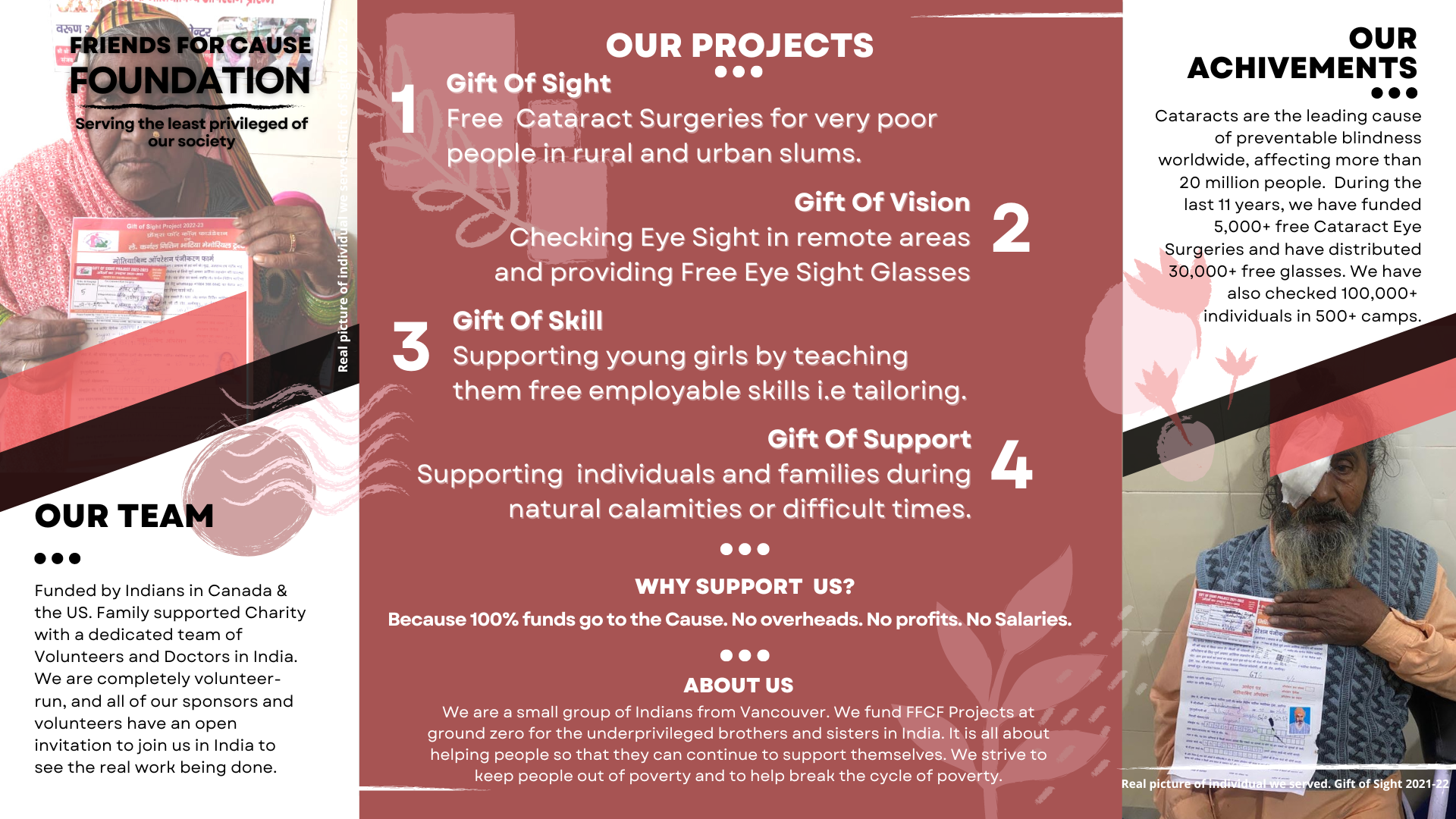 Friends For Cause Foundation (FFCF) is a dedicated non-profit that believes in empowering underprivileged communities in India through initiatives that tackle preventable blindness and poverty. With it sadly home to the wOur team in Barsana, India.orld's highest blind population, half of which is preventable, India is a focal point of our compassionate action.Last year, your generous contributions enabled us to facilitate over 3000 free cataract surgeries.Buoyed by this resounding success, we've set an even more ambitious target this year - to provide 3100 free surgeries, IN ADDITION to launching our Pilot Project 'Vision on Wheels' (Estimated $150K cost) which will help over 31,000 people annually once started.Our work embodies the principle of Das-Vant, a revered tradition advocating the contribution of at least 10% of one's income toward charitable activities. In keeping with this spirit, your donations will fuel our key initiatives:Gift of Sight: Our flagship project, which provides free cataract eye surgeriesOur founder, Yogesh Bhatia, talking to beneficiaries of our Gift of Sight Project 2022Gift of Vision: Which delivers free eyeglasses to those in need. 40,000 + free eyeglasses distributed to date.In addition, we run the Gift of Skill program, offering free tailoring courses to young women, empowering them to become self-sustaining, earning individuals.Gift of Support provides essential food and necessities to families in times of need, a project that was notably beneficial during the Covid-19 shutdowns.With FFCF, you can trust that 100% of your donation directly impacts those in need. We operate with minimum overheads, no profits, and no salaries, ensuring that your generous contribution creates meaningful change for India's underprivileged.Visit our website at friendsforcause.org to learn more about our initiatives, or contact us to arrange a donor meeting. Let's change lives together!