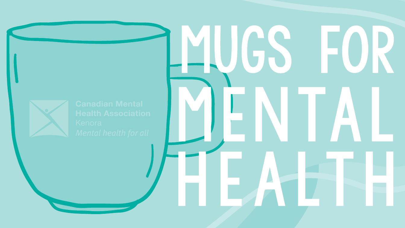 A large white coffee mug with the CMHA Kenora logo on the front and "LIFT EACH OTHER UP" on the inside rim. Detailing in black.