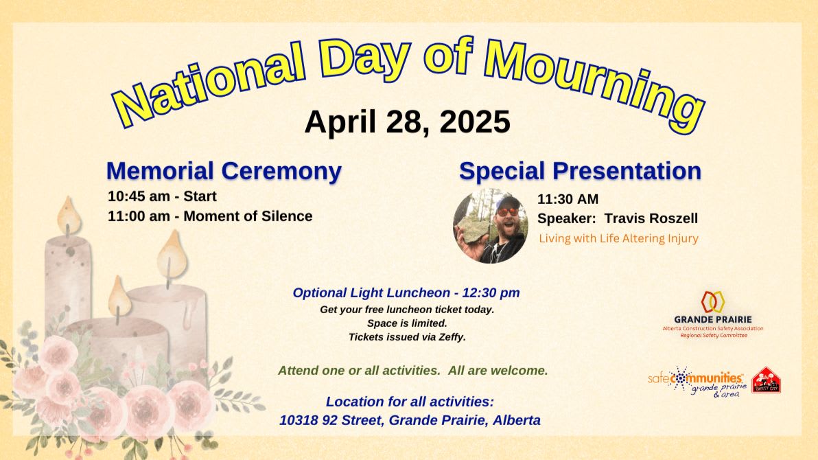 April 28, 2025, Day of Mourning Luncheon. 12:30 pm at 10318 92 Street, Grande Prairie. One ticket per person.