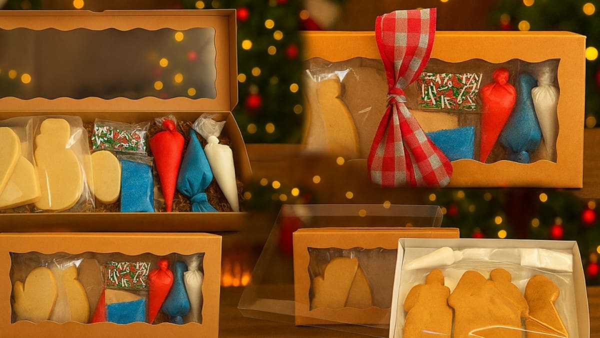 All you need to decorate 4 pre-baked Holiday cookies - Frosting in 3 different colors, and edible decorations - Nut Free,
