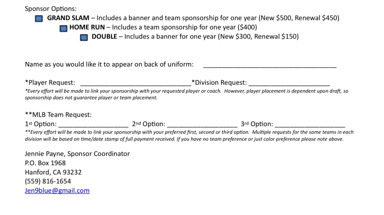 Hanford Youth Baseball sponsorship form