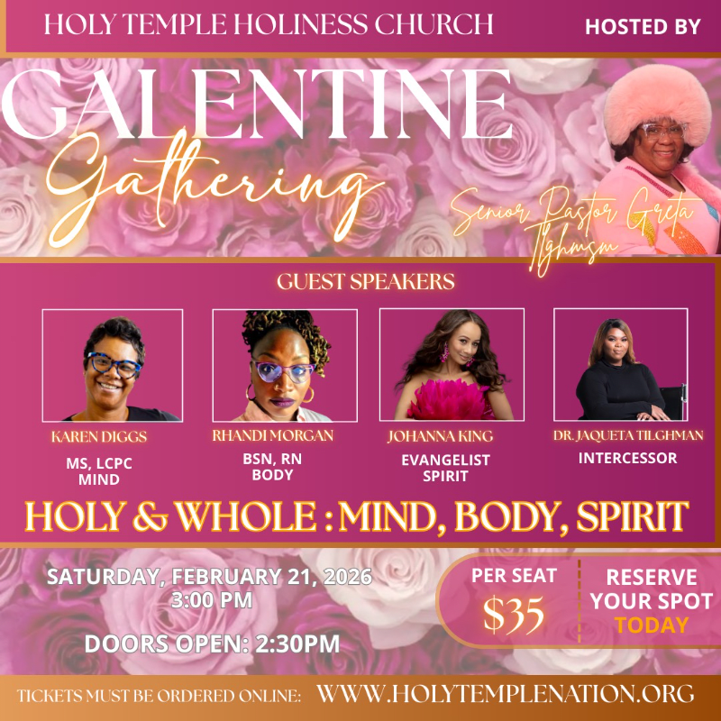 Holy Temple Holiness Church empowers individuals through spiritual growth, community engagement, and holistic wellness, fostering a supportive environment for healing and renewal in faith, particularly for Christian women seeking to live holy and whole.
