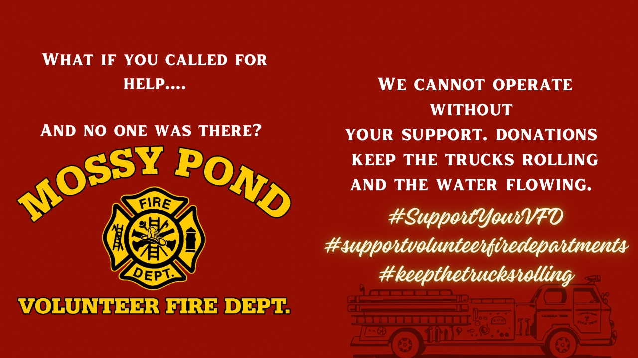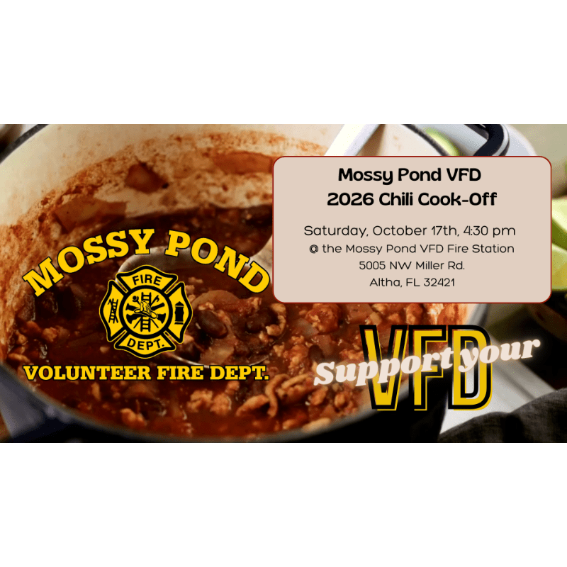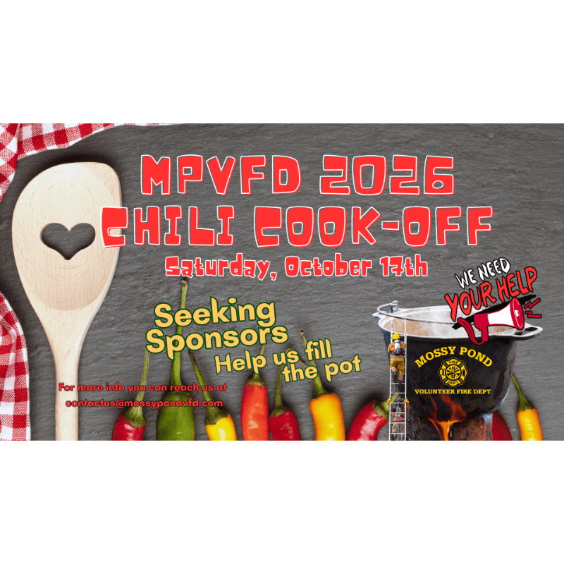 🔥 Help Us Heat Things Up at Mossy Pond VFD Chili Cook-Off! 🔥At Mossy Pond Volunteer Fire Department, we keep our community safe and lend a hand whenever you need it. Our annual Chili Cook-Off Fundraiser, scheduled for Saturday, October 17th, 2026, is the engine that fuels our efforts, but we need your help!Every dollar raised aids in the upkeep of our essential equipment. 🚒Your sponsorship could cover the cost of fuel for a month.⛽With $1000, we can upgrade our resources for better safety. 🎁Stand by your heroes today! A small contribution makes a huge difference. Plus, did we mention free chili? 😋Sponsorship levels:Habanero Level - $1000.00: This tier receives a 3’ x 6’ banner to be displayed all year in our department, opportunity to display company info at private table at event, sponsorship acknowledgement on all advertising, full page on event slideshow, verbal thanks by chief at event, and up to 5 complimentary meal tickets.Serrano Level - $500.00: This tier receives a 2’ x 4’ banner to be displayed all year in our department, opportunity to display company info at joint table at event, sponsorship acknowledgement on all advertising, full page on event slideshow, verbal thanks by chief at event, and up to 3 complimentary meal tickets.Jalapeño Level - $250.00: This tier receives a 12” x 18” garden flag style banner, opportunity to display company info at joint table at event, verbal thanks by chief at event, and up to 2 complimentary meal tickets.Poblano Level - Donation of your choice up to $249.99 value.All sponsors, regardless of donation amount or value, will receive a tax-deductible receipt, social media post, a place on the slideshow playing at the event, and 1 complimentary meal ticket.