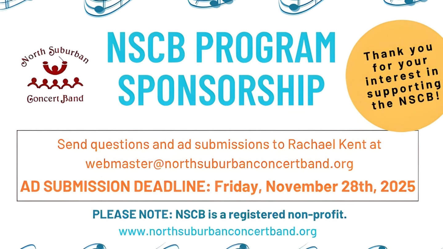 Thank you for your interest in supporting the NSCB!WHAT DOES MY PURCHASE GET ME?As a sponsor, you will get you:- A printed ad in our Pops Concert program (options and prices below) • Audience capacity of about 250 Pops Concert- Your business logo and link on our website- Your business logo and tag on social media (Facebook and Instagram)SPONSORSHIP OPTIONS AND PRICES- Full Page (8.5"x11") ................. $250- 1/2 Page (8.5"x5.5") ................ $160- 1/4 Page (4.25"x5.5") .............. $85- 1/8 Page (Business Card) ........ $45PLEASE NOTE: North Suburban Concert Band is a registered non-profit.Send questions and ad submissions to Rachael Kent at [email protected] SUBMISSION DEADLINE: Friday, November 28th, 2025