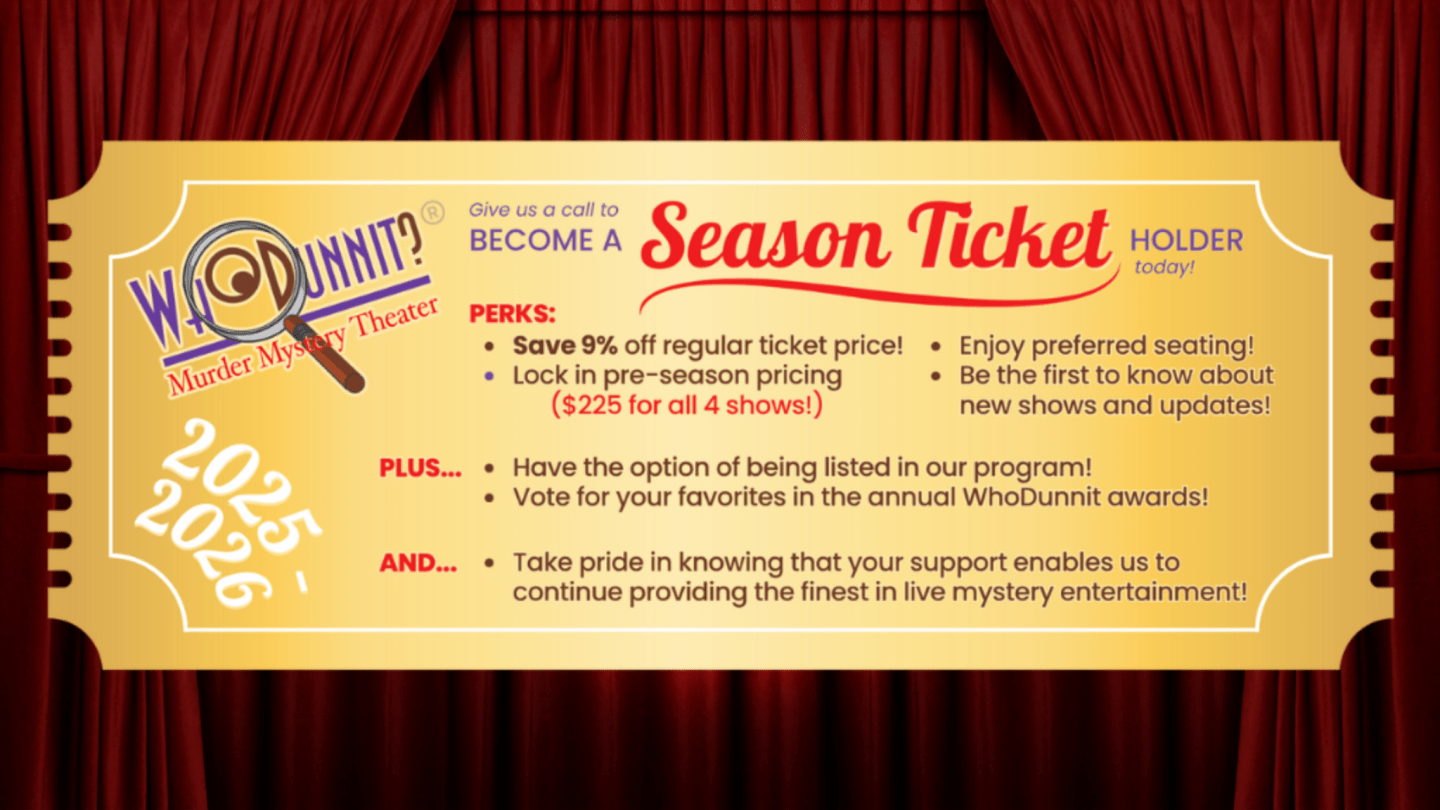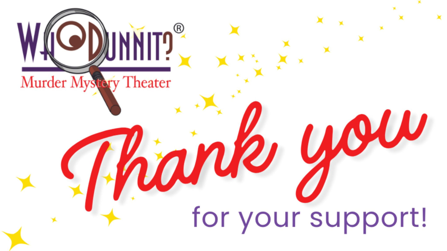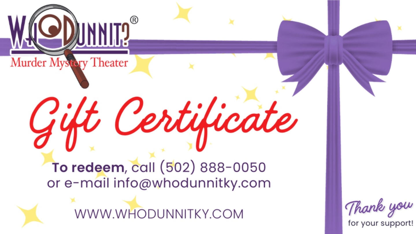 If you’ve read the program of any theater group, you probably know that ticket sales cover only a small portion of the funds needed to operate. Like most theater groups, we rely on corporate and individual contributions for our support. However, unlike many of them, we won’t e-mail you soliciting donations or phone you at dinnertime, asking for your pledge. We’re hoping that, because of the good work that we do, you’ll want to support our efforts.What are the benefits for you?Sponsor benefits ($500 contribution and up) include a promotional announcement about you or your company at the beginning of a sponsored show, sponsorship signs in the performance area, preferred seating, and much more. For a full list of sponsor benefits, click here.What are the benefits for WhoDunnit?With your help, we can continue to create the unique, thoroughly original mysteries that have become so popular with Louisville audiences, and that continue to intrigue and delight! Our operating expenses are daunting — costumes, props, sets, historical research, staff to manage your reservations efficiently, phone and Internet resources, sound and lighting equipment, road crew and technicians … so much goes into making a quality production. Your contribution keeps what’s happening behind the scene running smoothly, so that we can keep the magic happening on stage!What are the benefits for the community?We believe in mystery theater as an art form, and we try to reflect that by providing the finest in mystery entertainment. In addition to our main season performances, we also perform at schools, charity functions and social-service organizations, many of which have limited funds. Your contribution helps to subsidize these. We also welcome first-timers (adults with talent and initiative but limited stage experience) and students as young as 17 to our auditions, providing training and guidance. WhoDunnit has given many now-successful performers and directors their first professional role.How much is a contribution?Any amount is welcome! Contributions of $20 and up are listed in the program. Sponsorship of an individual performance (you can pick which one) is $500. Sponsorship of a production (the entire run of a show, which is usually seven to nine weeks) is $2,500. Sponsorship of an entire year (four full productions, running seven to nine weeks each) is $5,000. You can also help out by purchasing a season ticket by October 31 of each year.How can you contribute?It’s easy! Just make a donation on this form, see one of your hosts at any WhoDunnit show, or phone us at (502) 888-0050. It’s no mystery that our success depends on you. * * * WhoDunnit, Inc. is a 501(c)(3) donation-supported nonprofit corporation for the performing arts, dedicated to the principle that a well-crafted mystery is a beautiful thing.