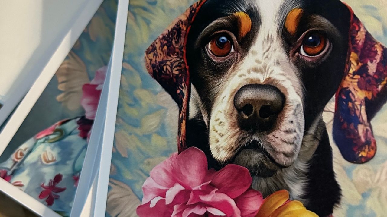 Nelly is a Beagle mix and she was left behind when a family was evicted. She was dehydrated and eating dead flowers and what little water that was in the vase. She was adopted after weeks of veterinary care and now has a forever home. This card honors her resilience and her sad eyes actually smile now and she is blooming again!