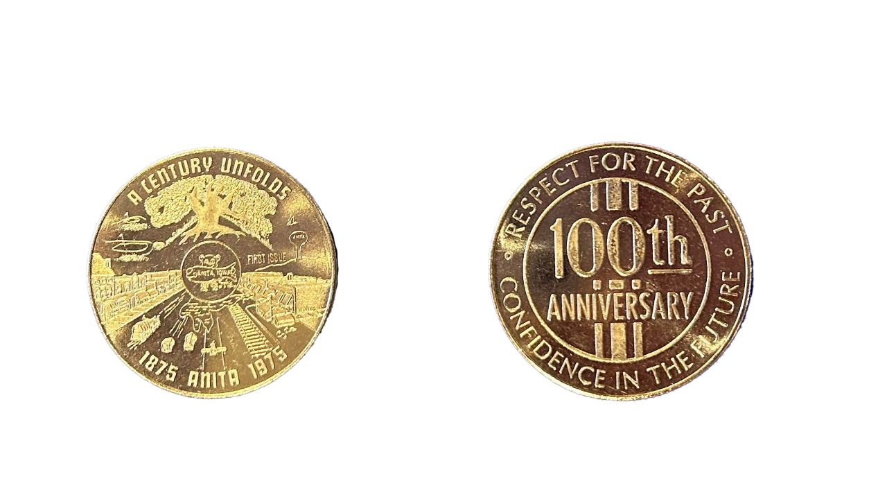 Enjoy a piece of Anita's history with an original 1975 Centennial coin. They are gold in color. Shipping is included in the price.