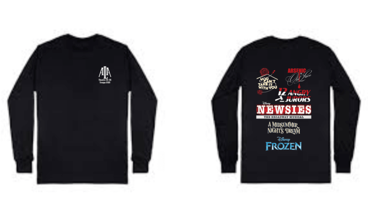Long sleeve black t-shirt with white logo on front and full color on back