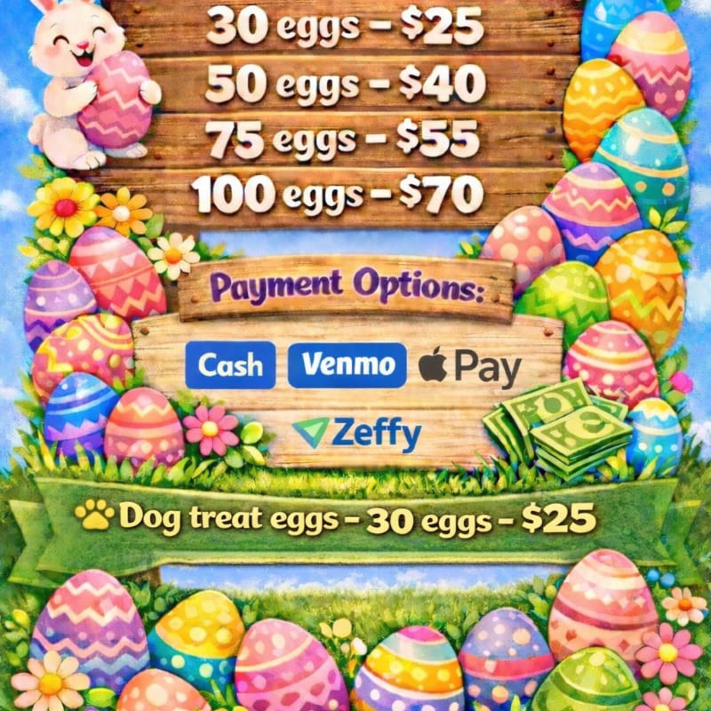 30 dog treat-filled eggs for your pup, hidden in your yard the Saturday evening before Easter.