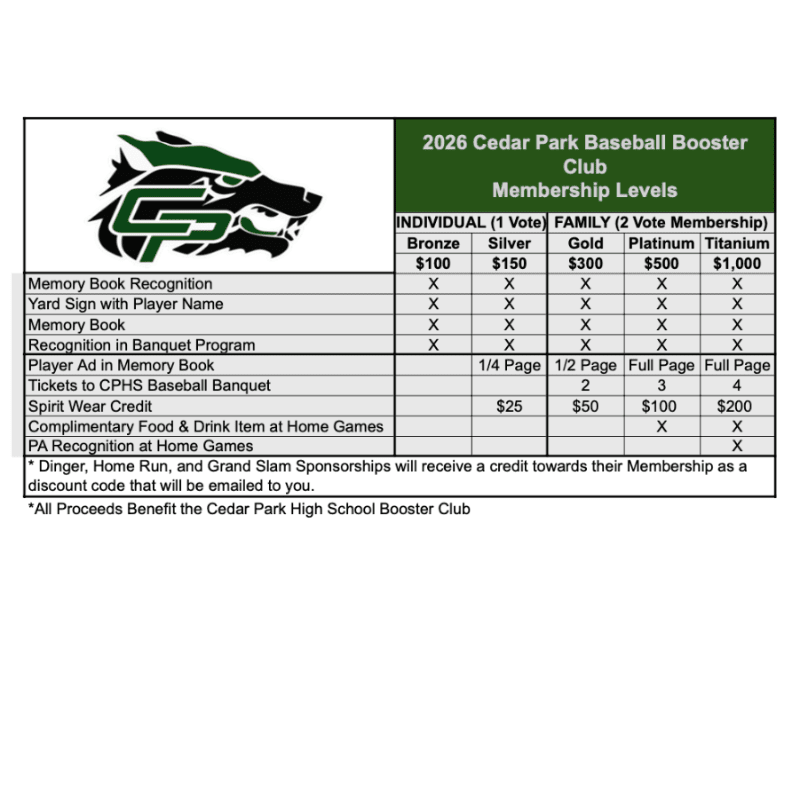 Titanium membership comes with the following: 1. Memory Book Recognition 2. Yard Sign with Player Name 3. Memory Book 4. Recognition in Banquet Program 5. 2 Votes for CPHS Baseball Booster Club 6. 1 Full Page Ad/Shout-Out in Memory Book 7. $200 Spirit Wear Credit 8. Four Tickets to the Baseball Banquet 9. Complimentary Concessions Food & Drink Item at Home Games 10. PA Recognition at Home Games
