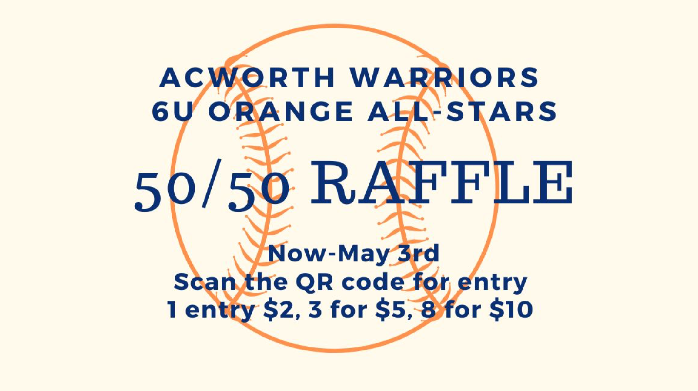 This bundle includes 1 tickets for 2 dollars entering you into the Acworth Warriors 6U Orange 50/50 Raffle.