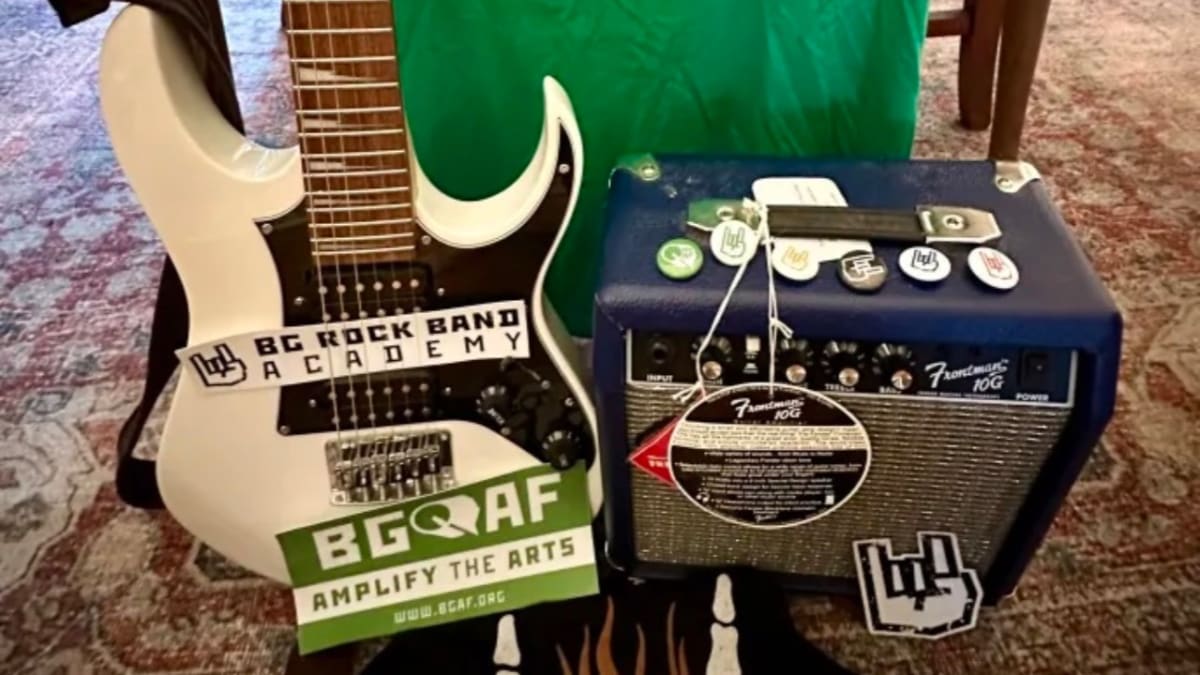 Mega Guitar Bundle - Guitar, Amp, Shirts, Stickers, Buttons, Pics, and 1 month of lessons at BG Rock Band Academy!
