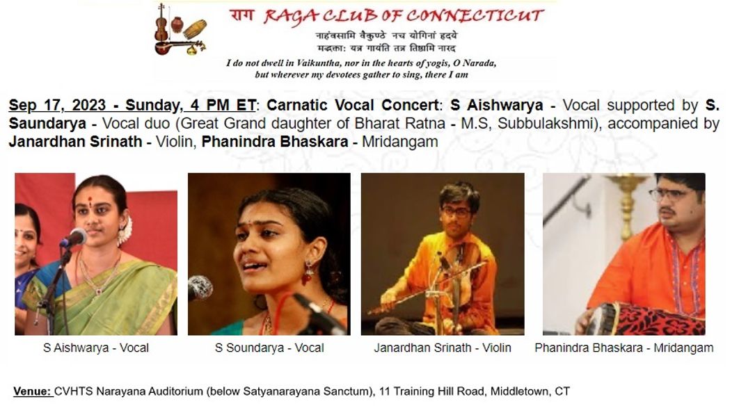 Sep 17, 2023 - Sunday, 4 PM ET: Carnatic Vocal Concert: S Aishwarya - Vocal supported by S. Saundarya - Vocal duo (Great Grand daughters of Bharat Ratna - M.S, Subbulakshmi), accompanied by Janardhan Srinath - Violin, Phanindra Bhaskara - Mridangam