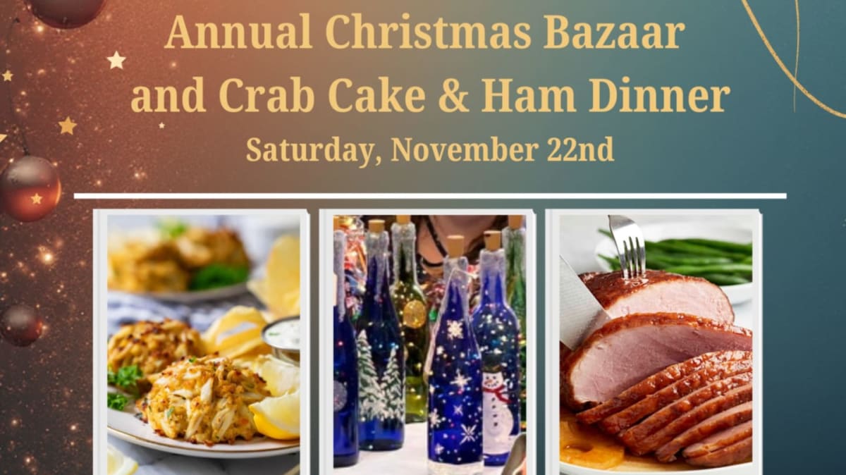 Meal includes a Crab Cake, Ham, Cole Slaw, Corn Pudding, Green Beans, Potatoes, a Roll, and Dessert
