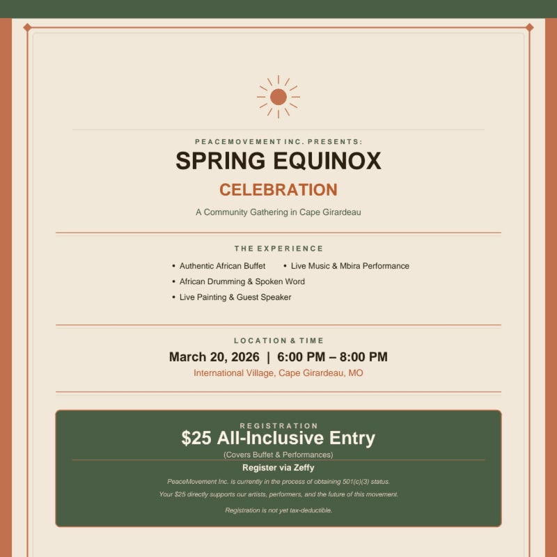 The Peace Spring Equinox Celebration is a community gathering hosted by PeaceMovement Inc. in Cape Girardeau to celebrate culture, unity, and the arrival of spring. This special evening brings people together to share food, art, music, and meaningful conversation while supporting PeaceMovement’s community initiatives.