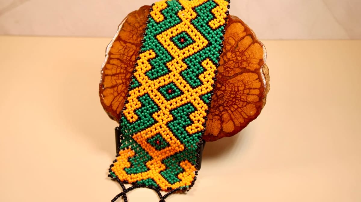 Hand-beaded Ayahuasca & Chiric Sanango Kené Design. Vibrant Orange & black Beads with seed clasps.