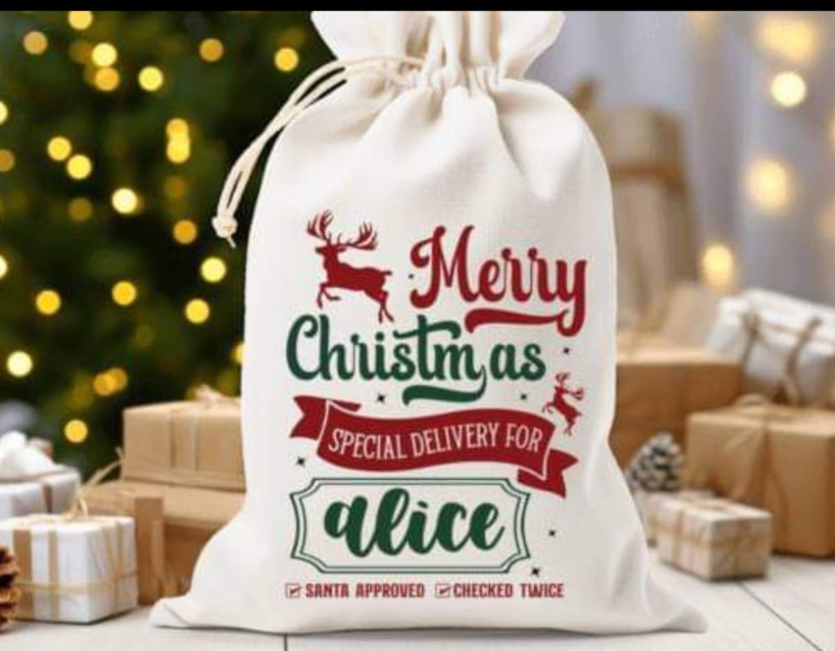 26.8”x18.9” gift sack bag. Name can be left blank so you can personalize it yourself or each bag can be personalized for $1.00 extra. Please double check the spelling of each name. It will be printed exactly how it is typed.