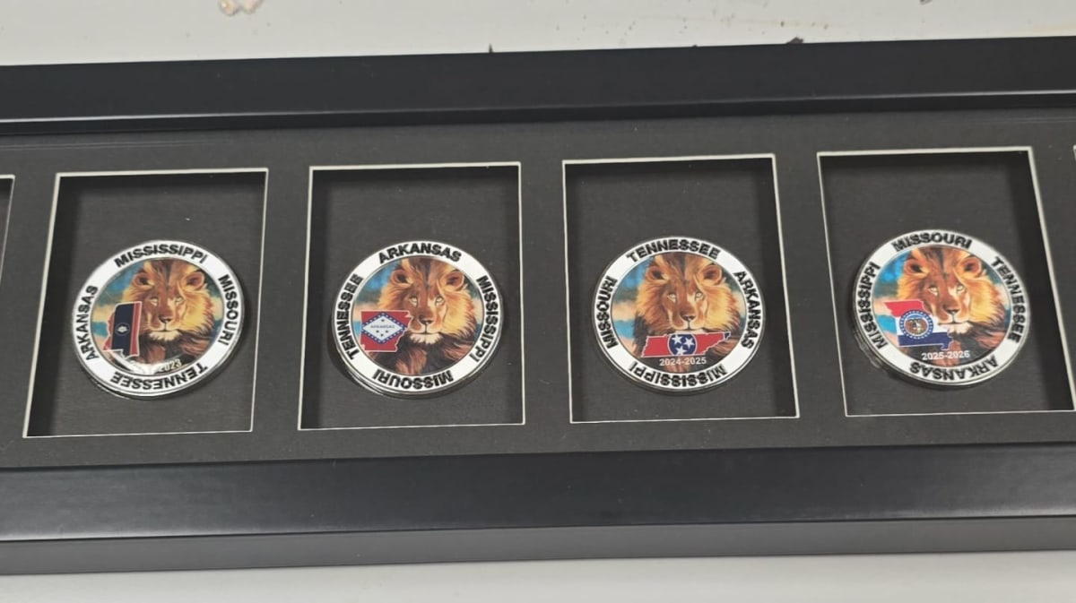 Challenge coins from Arkansas, Mississippi, Missouri, Tennessee, Mid-South Lions 60th and 70th Anniversary Commemorative coins matted and framed for display.