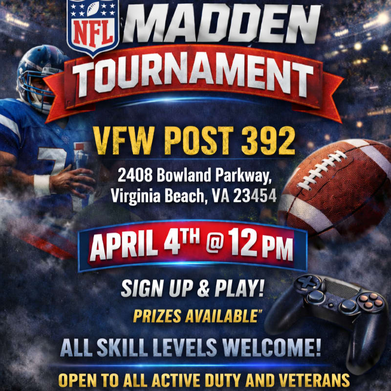 Enjoy the full program with access to all main activities. This is an in-person tournament to be held at VFW Post 392 in Virginia Beach, VA. Ticket required for entry into the tournament.