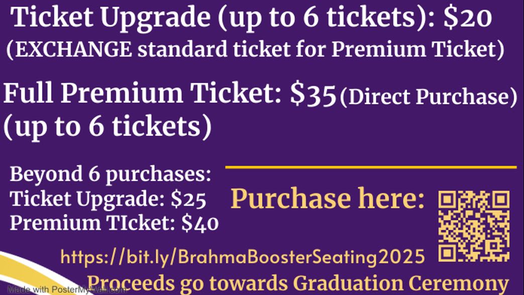 AFTER Purchasing a Brahma Booster membership, you are eligible to exchange your standard graduation ticket to an upgraded Brahma Booster Graduation PREMIUM Seating Ticket (Limit 6). Tickets beyond 6 can be purchased for $25 each on the next line. *Note: this is an EXCHANGE of a physical ticket you already have for the PREMIUM ticket. If you do not have a ticket and want to buy one please purchase the Direct Purchase PREMIUM ticket.