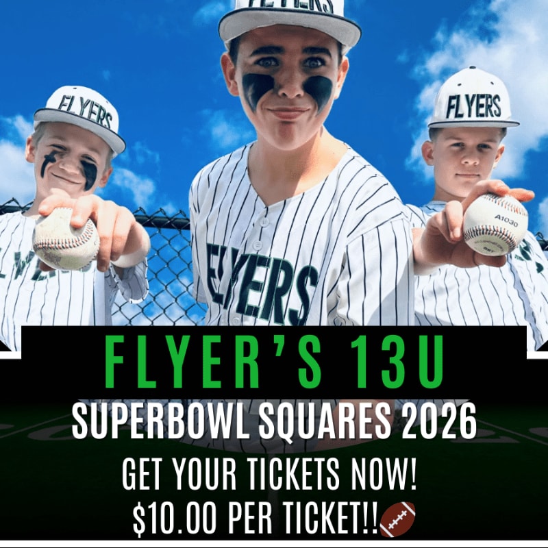 Score big with Flyers 13U Super Bowl Squares! 🎉 At just $10 each, buy as many as you want for a chance to win up to $500. Your ticket supports our team with uniforms and fees. Dive into the excitement and grab your squares today! 🏈💰