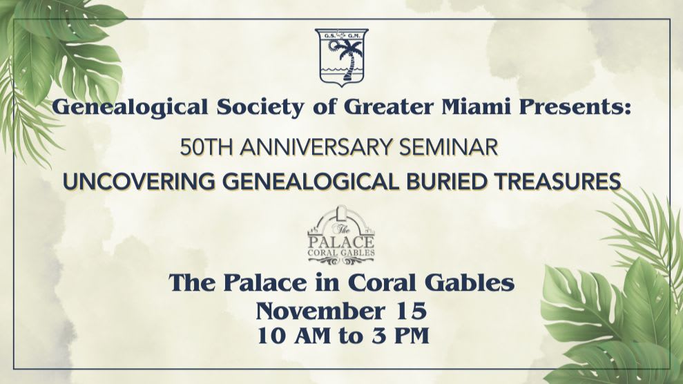 Grants entry to the event, two presentations, a full lunch and membership to the Genealogical Society of Greater Miami through Dec 2026. See member benefits here: www.gsgmfl.org/join