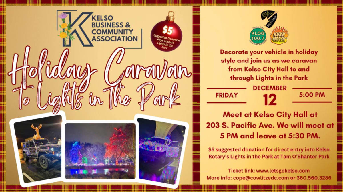 Entry for 1 vehicle to Holiday Caravan to Lights in the Park. Ticket donations go to Rotary Club of Kelso.