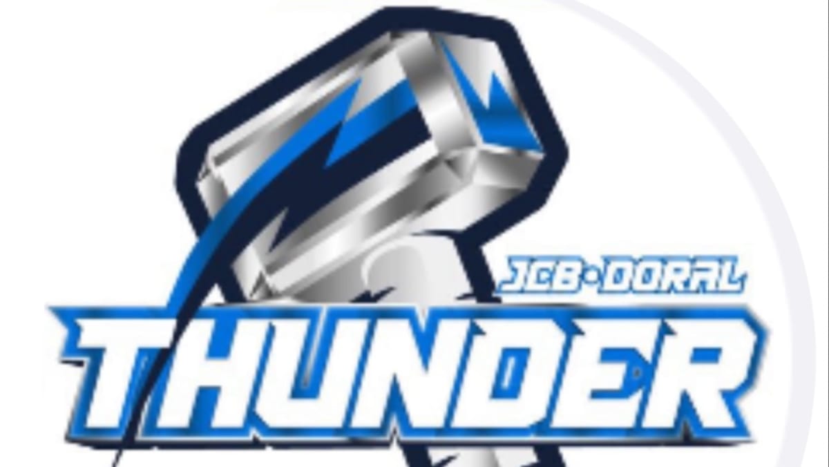 Blue umbrella with Thunder logo.
