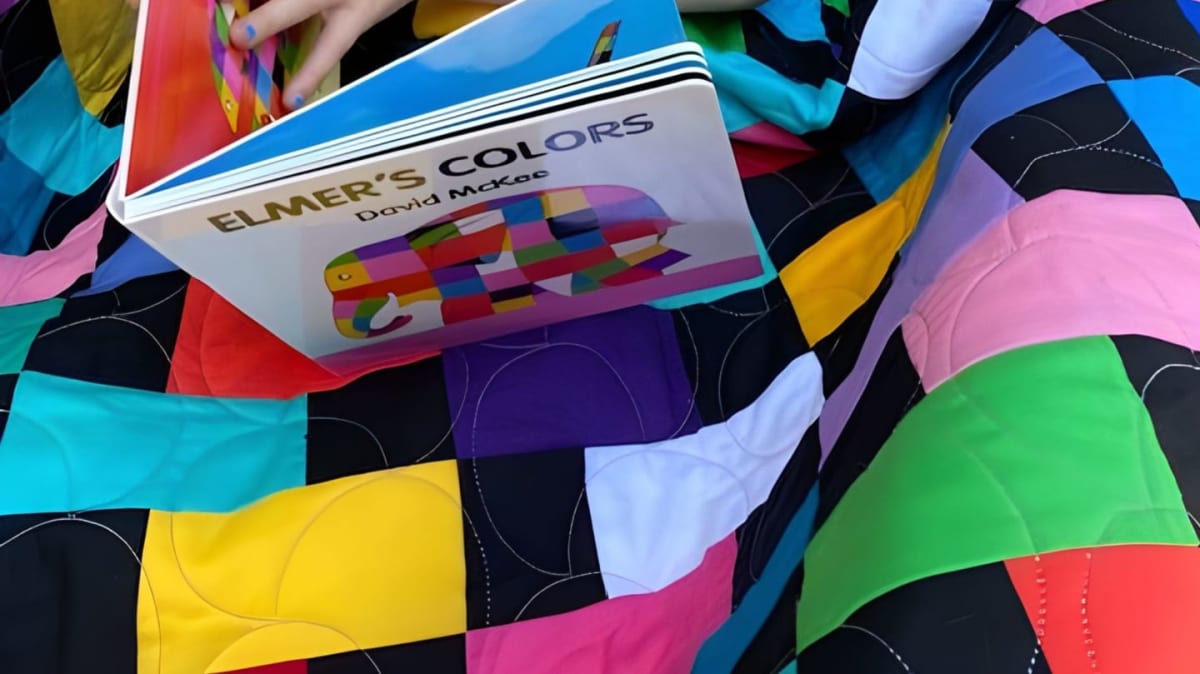The 38"x45" quilt in many colors is featured in the accompanying book, Elmer.