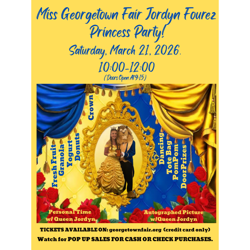 Join us for a magical morning at the Miss Georgetown Fair Queen Jordyn Fourez Princess Party β a special fundraiser benefiting the Miss Georgetown Fair Queen Pageant!