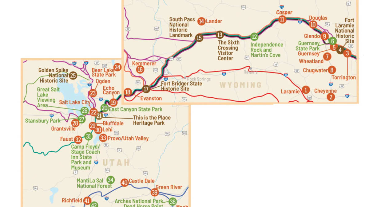 The Mormon Pioneer National Historic Trail is the historic route that crosses Wyoming and Utah, carrying tens of thousands of Mormon emigrants to the Great Salt Lake Valley starting in 1847. While not a single, marked trail, this corridor runs through communities, urban areas, and public lands, with notable sites in Wyoming like Fort Bridger and, in Utah, sites like Little Emigration Canyon and This Is The Place Heritage Park near Salt Lake City. Travelers can explore this history through auto tours, visitor centers, and by visiting individual trail sites.