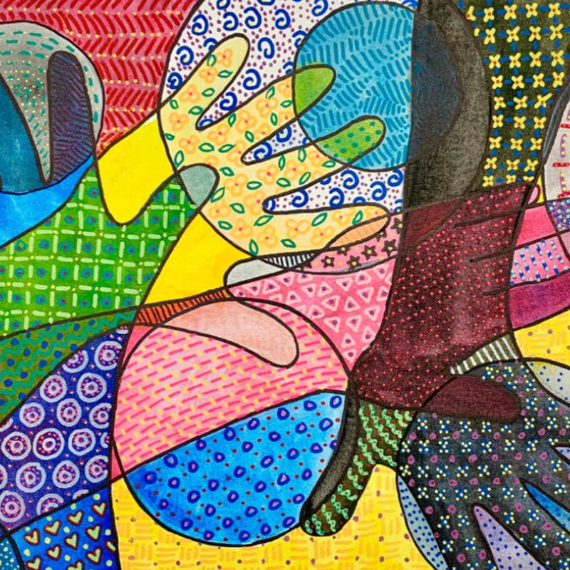 Student artists designed colorful artwork on 4 × 4 plastic sheets using permanent markers. After baking to reduce their size, the pieces were mounted on canvas. Framed size: 12 × 12