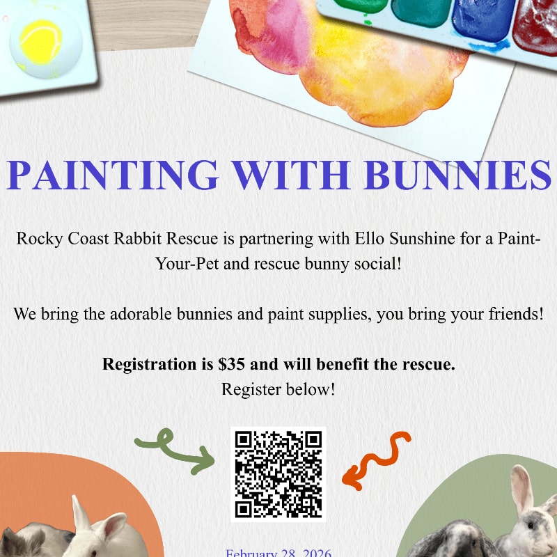 Ello Sunshine will pre-outline your painting of your pet before the event and bring all the supplies needed. The artist will provide education and support throughout the process. Visit with adoptable rabbits before and after painting!