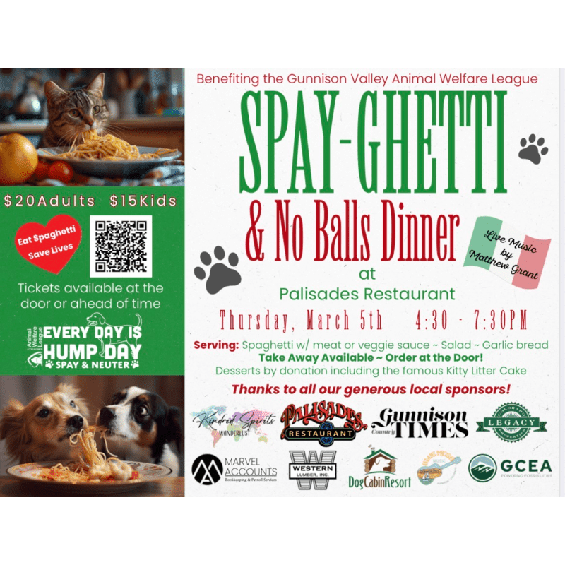 One adult (over the age of 10) ticket includes salad, spayghetti, bread, and a soft drink, all enjoyed while listening to the music of Matthew Grant of Blue Mesa Music. The bar will be open and desserts will be available by donation.