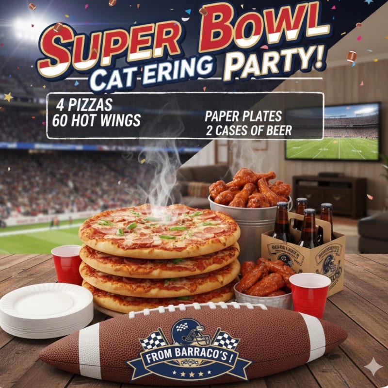 Get ready for the Super bowl! Get Barraco's catering that includes:60 chicken wings, 4 pizzas, 2 cases of beer and paper plates.