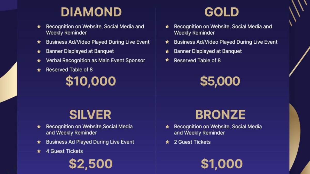 Recognition on Website, Social Media and Weekly Reminder, Business Ad played during live event,