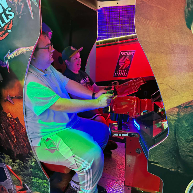 NON-playing only. You may enter the laser arena with your supported person, but will not have a vest or laser gun. You are welcome to play the arcade games.