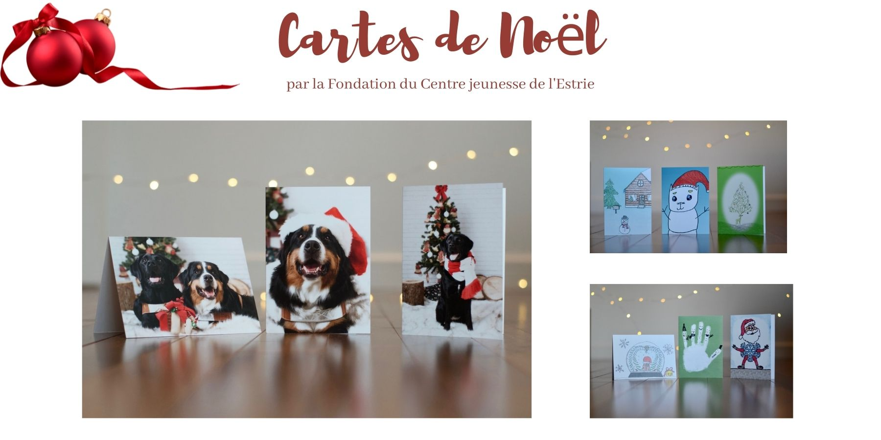 Cartes dessinées par les jeunes du Centre jeunesse de l'Estrie (la main, la boule de Noël et le Père Noël flocon)