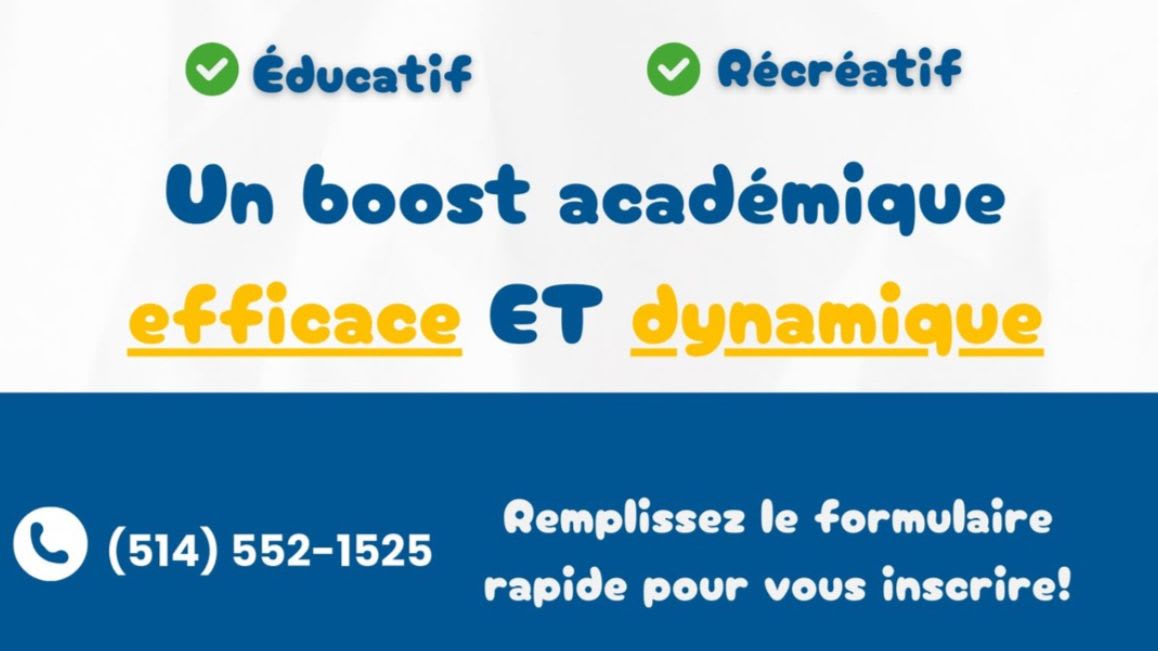 Offrez à votre enfant une semaine structurée et productive du 3 au 7 mars pour rattraper des notions, prendre de l’avance ou travailler sur ses difficultés dans un cadre motivant et encadré. Tout au long de la journée, il bénéficiera d’un accompagnement scolaire personnalisé pour assurer un retour en force après la relâche. Les horaires sont flexibles, avec une arrivée possible entre 8h et 18h selon votre convenance. Nous fournissons tout le matériel nécessaire et assurons un suivi adapté à chaque élève. En plus des apprentissages, des activités éducatives et stimulantes sont prévues pour favoriser la motivation. Le tout à un prix exceptionnel de 250$ pour la semaine complète !