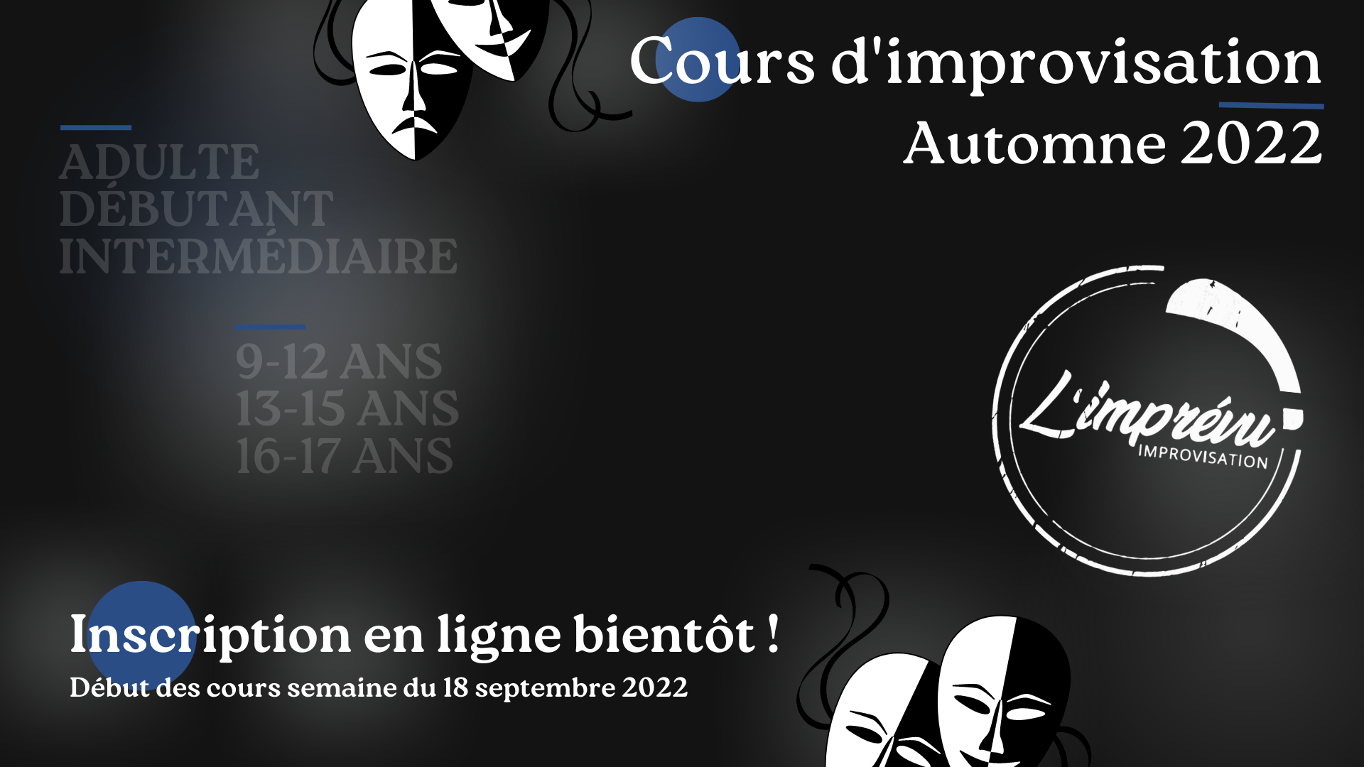 Un groupe d’impro est un espace sécuritaire favorisant l'expression libre et le bien-être de chacun. Au terme de cette formation, l’étudiant sera en mesure de comprendre les fonctions de l’outil principal de l’improvisateur (lui-même!) et son environnement ainsi que la relation avec ses partenaires de jeu et le public. La session se termine par un spectacle devant public où les étudiant.e.s pourront démontrer leur savoir faire acquis au cours des semaines.