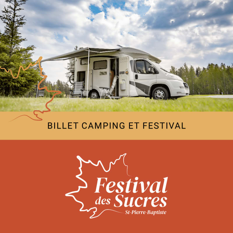 Billet donnant droit à (1) espace de camping sans services sur le site du Festival des Sucres et à (1) admission pour (1) personne au site du Festival des Sucres du mercredi 13 mai 2026 au dimanche 17 mai 2026. Permis de camping #628171