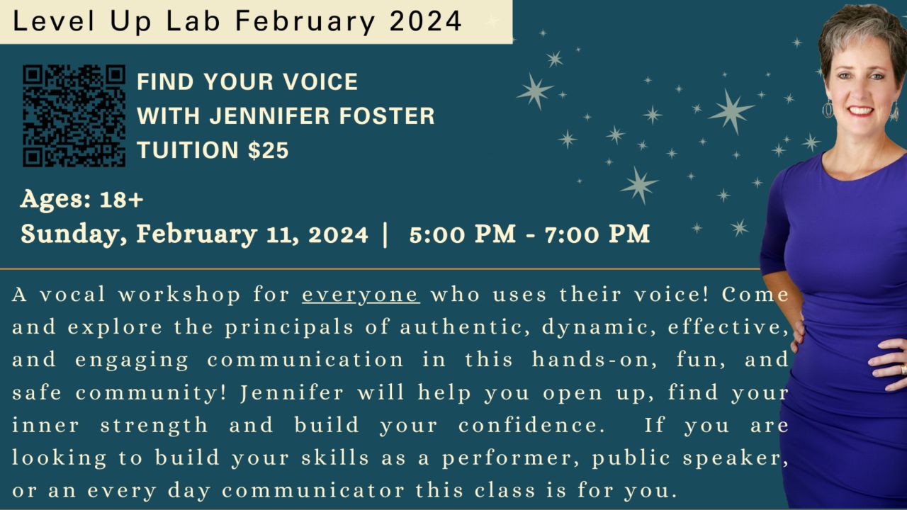 Sunday February 11, 2024| 5:00 PM - 7:00 PM| Community Stages' LEVEL UP LAB is proud to present - Find Your Voice. Led by guest Instructor Jennifer Foster, this workshop is open to anyone ages 18 and over.| Find Your Voice is a vocal workshop for everyone who uses their voice! Come and explore the principals of authentic, dynamic, effective, and engaging communication in this hands-on, fun, and safe community! Jennifer will help you open up, find your inner strength and build your confidence. If you are looking to build your skills as a performer, public speaker, or an every day communicator this class is for you.| Class is held at Chelsea Art Center - 3305 E. Silver Springs Blvd. Ocala, FL 34470 Learn more at chelseaartcenter.com