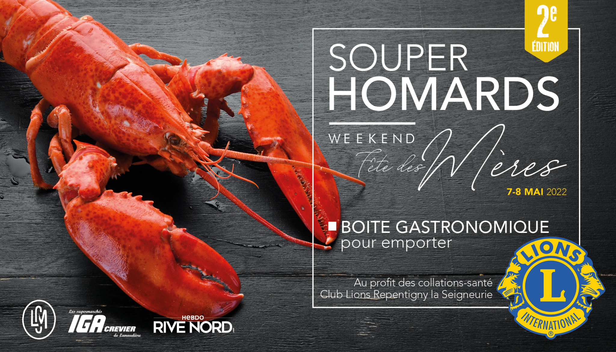 Entrée, 6 homards, pain, salade, beurre à l’ail, citron, et un délicieux dessert concocté par restaurant Le Coup monté.