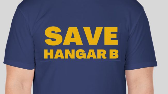 Our "Save Hangar B" tees are a 50/50 blend unisex t-shirt, screen-printed locally on navy blue t-shirts.