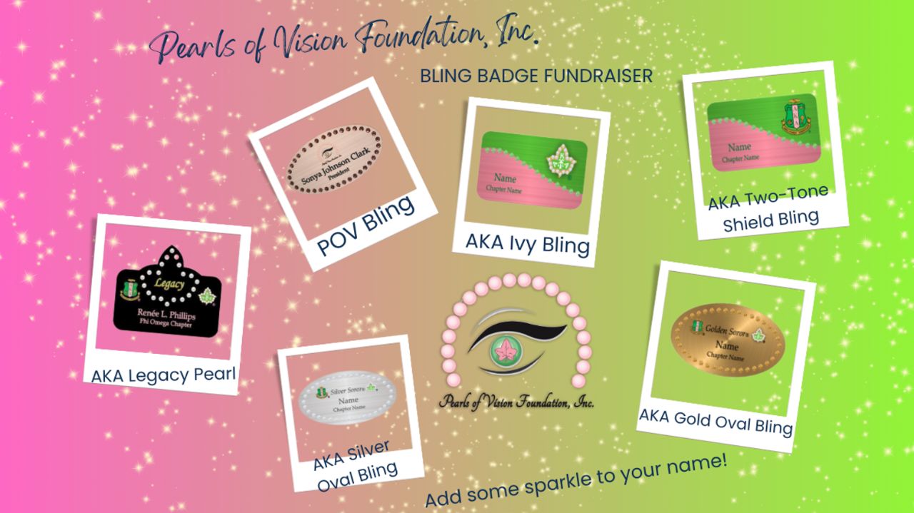 Get your Pearls of Vision Foundation, Inc. bling name badge! Add up to two lines.