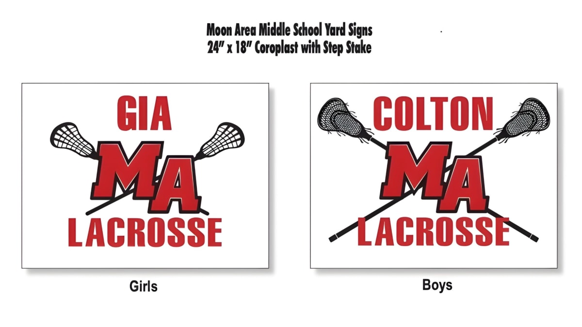 24" x 18" Coroplast with Step Stake. ORDERS AND PAYMENTS ARE DUE BY FRIDAY, MARCH 28. Orders will be distributed at practice. Any questions, please contact Jody Dennis - [email protected] or 814-221-0948