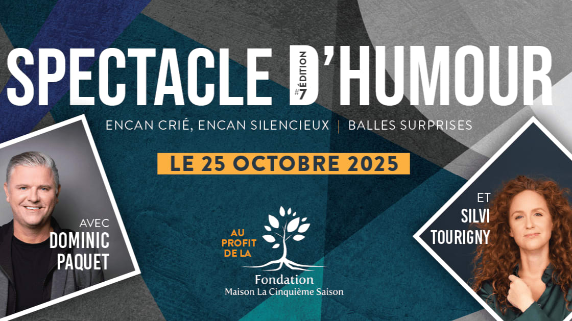 Soirée d’humour avec... Dominic Paquet et Sylvi Tourigny Au bénéfice de la Fondation Maison La Cinquième Saison 25 octobre 2025. Vous pouvez également réserver 8 ou 10 billets pour une table complète.