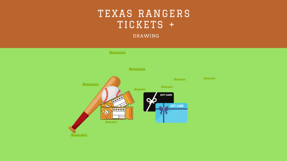 The drawing includes a $100 gift card from Scheels, a $100 gift card from QT, and two vouchers for Texas Rangers tickets. Please note that the ticket vouchers are valid only on specific days.